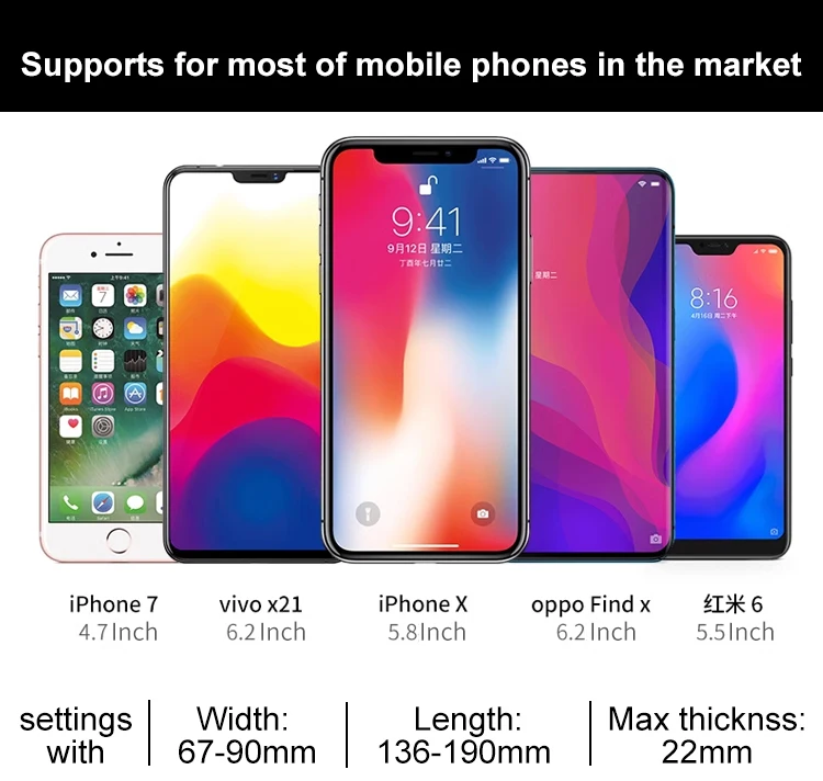Size of mobile phone that can be clamped: width 69-93mm, height 137-212mm, thickness 21mm