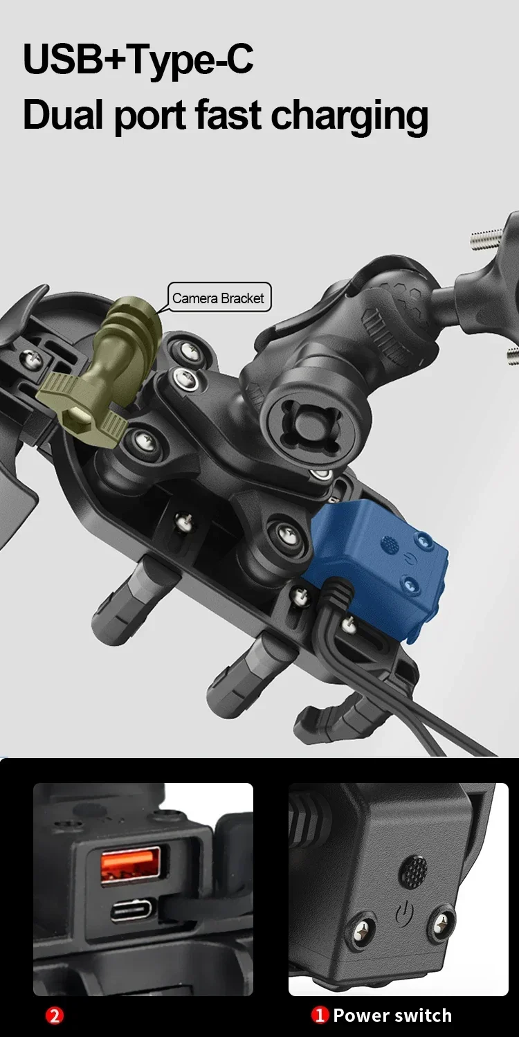 1. Versatile Charging Options: The motorcycle phone holder supports wireless charging, USB, and TYPE-C fast charging, ensuring efficient and quick power-ups for your device. It accommodates phones with widths of 69-93mm, heights of 137-212mm, and thicknesses of 21mm, making it suitable for most smartphones.
